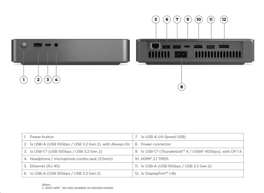 | Predné porty | 1x USB-C® (USB 10Gbps / USB 3.2 Gen 2) 1x USB-A (USB 10Gbps / USB 3.2 Gen 2), with Always On 1x headphone / microphone combo jack (3.5mm) |