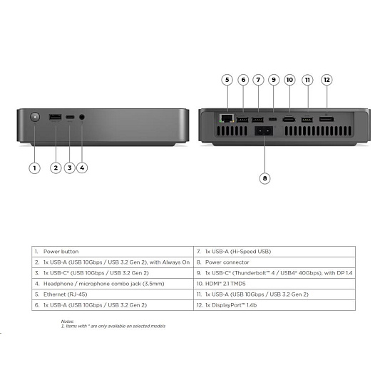 | Zadné porty | 1x USB-C® (Thunderbolt™ 4 / USB4® 40Gbps), with DisplayPort™ 1.4 1x USB-A (Hi-Speed USB / USB 2.0) 2x USB-A (USB 10Gbps / USB 3.2 Gen 2) 1x HDMI® 2.1 TMDS 1x DisplayPort™ 1.4b 1x Ethernet (RJ-45) 1x power connector |