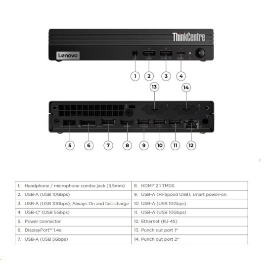 | Predné porty | 1x USB-C® (USB 5Gbps / USB 3.2 Gen 1), with 5V@0.9A charging 1x USB-A (USB 10Gbps / USB 3.2 Gen 2), with Always On and 5V@2.1A charging 1x USB-A (USB 10Gbps / USB 3.2 Gen 2) 1x headphone / microphone combo jack (3.5mm)  |
