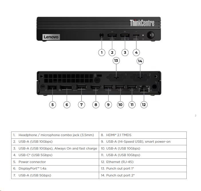 | Predné porty | 1x USB-C® (USB 5Gbps / USB 3.2 Gen 1), with 5V@0.9A charging 1x USB-A (USB 10Gbps / USB 3.2 Gen 2), with Always On and 5V@2.1A charging 1x USB-A (USB 10Gbps / USB 3.2 Gen 2) 1x headphone / microphone combo jack (3.5mm)  |