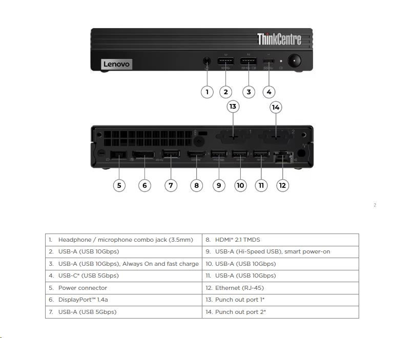 | Predné porty | 1x USB-C® (USB 5Gbps / USB 3.2 Gen 1), with 5V@0.9A charging 1x USB-A (USB 10Gbps / USB 3.2 Gen 2), with Always On and 5V@2.1A charging 1x USB-A (USB 10Gbps / USB 3.2 Gen 2) 1x headphone / microphone combo jack (3.5mm)  |