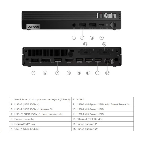 | Predné porty | 1x USB-C® (USB 10Gbps / USB 3.2 Gen 2), data transfer only 1x USB-A (USB 10Gbps / USB 3.2 Gen 2), with Always On and 5V@2.1A charging 1x USB-A (USB 10Gbps / USB 3.2 Gen 2) 1x headphone / microphone combo jack (3.5mm)  |