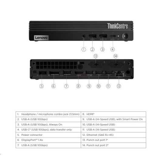 | Predné porty | 1x USB-C® (USB 10Gbps / USB 3.2 Gen 2), data transfer only 1x USB-A (USB 10Gbps / USB 3.2 Gen 2), with Always On and 5V@2.1A charging 1x USB-A (USB 10Gbps / USB 3.2 Gen 2) 1x headphone / microphone combo jack (3.5mm) |