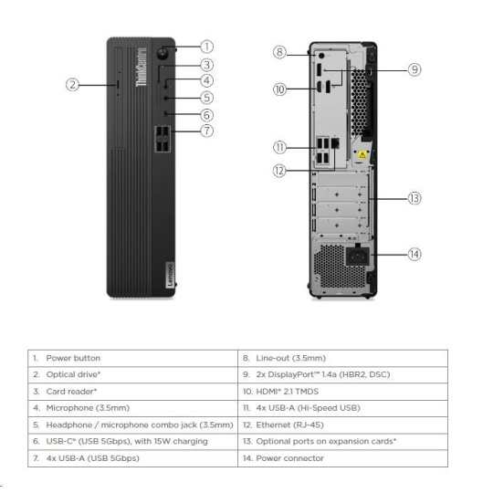 | Predné porty | 1x USB-C® (USB 5Gbps / USB 3.2 Gen 1), with 15W charging 4x USB-A (USB 5Gbps / USB 3.2 Gen 1) 1x headphone (3.5mm) 1x headphone / microphone combo jack (3.5mm)  |