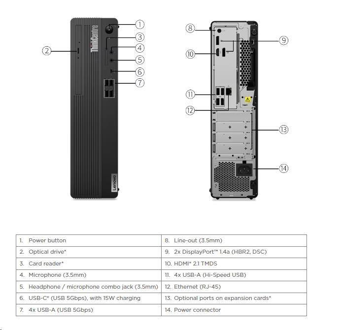 | Predné porty | 1x USB-C® (USB 5Gbps / USB 3.2 Gen 1), with 15W charging 4x USB-A (USB 5Gbps / USB 3.2 Gen 1) 1x headphone (3.5mm) 1x headphone / microphone combo jack (3.5mm) |