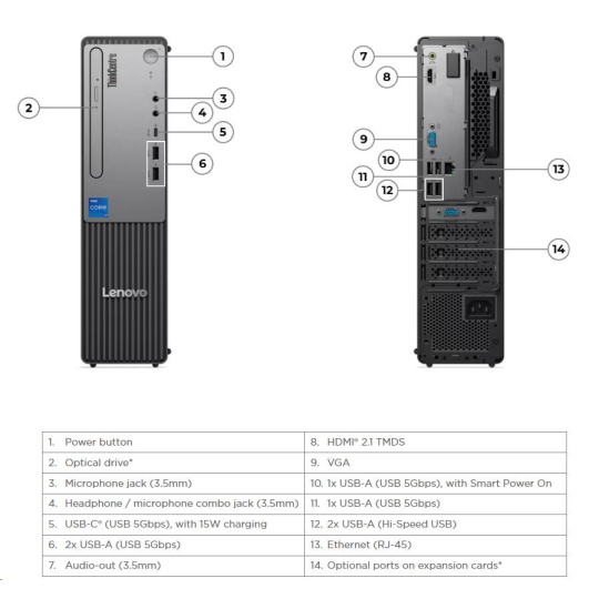 | Zadné porty | 2x USB-A (Hi-Speed USB / USB 2.0) 2x USB-A (USB 5Gbps / USB 3.2 Gen 1), one supports Smart Power On 1x HDMI® 2.1 TMDS 1x VGA 1x Ethernet (RJ-45) 1x line-out (3.5mm) |