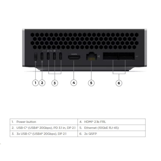 | Zadné porty | 1x USB-C® (USB 20Gbps / USB4®), with USB PD 3.1 in and DisplayPort™ 2.1 2x QSFP (200Gbps each, for connecting two ThinkStation® PGX units) 3x USB-C® (USB4® 20Gbps), with DisplayPort™ 2.1 1x HDMI® 1x Ethernet (10GbE RJ-45) |
