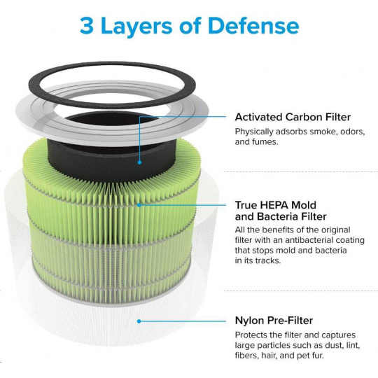 Druhou vrstvou je HEPA filter H13. To odlišuje Levoit od konkurencie, pretože filter HEPA H13 je oveľa kvalitnejšie a spoľahlivejšie ako bežne používané HEPA H11. Tu sa odfiltrujú jemné prachové častice, pleseň, baktérie, peľ, dymové častice, roztoče a srsť.