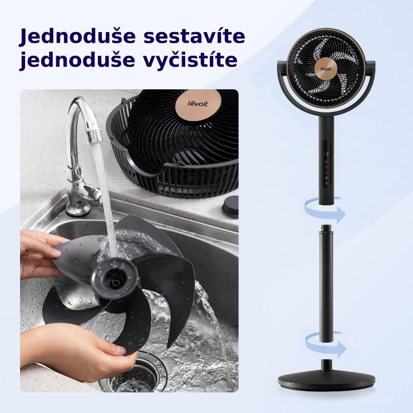 Stojanový ventilátor Levoit sa ľahko montuje bez potreby akéhokoľvek náradia, čo šetrí váš čas a námahu. Je navrhnutý tak, aby sa dal ľahko rozobrať a umyť vodou, čím sa zabezpečí hygienické prostredie a minimalizuje sa vírenie prachu po miestnosti. Vďaka tejto pohodlnej údržbe si môžete užívať čistý a svieži vzduch bez akýchkoľvek problémov.