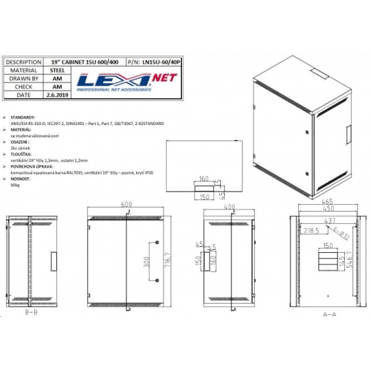 LEXI-Net 15U rack, plná hĺbka plechu 400 mm - ŠTANDARDY: ANSI/EIA RS-310-D, IEC297-2, DIN41491 - časť 1, časť 7, GB/T3047, 2-92STANDARD - MATERIÁL: oceľ valcovaná za studena - UPEVNENIE : 2ks zámok - POVRCHOVÁ ÚPRAVA: vertikálne 19" koľajnice 1,5 mm, ostatné 1,2 mm - povrchová úprava: komaxitová zapečená farba RAL7035, vertikálne 19" koľajnice - pozinkované - NOSNOSNOSŤ: 60 kg ROZMER: Š x V x H 600x720x400 mm..