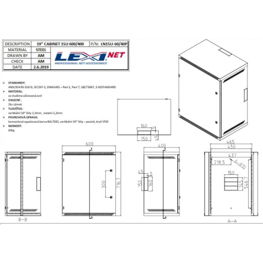 LEXI-Net rack 9U, plný plech, hĺbka 400 mm - ŠTANDARDY: ANSI/EIA RS-310-D, IEC297-2, DIN41491 - časť 1, časť 7, GB/T3047, 2-92STANDARD - MATERIÁL: oceľ valcovaná za studena - UPEVNENIE : 1ks zámok - PLECH: vertikálne 19" koľajnice 1,5 mm, ostatné 1,2 mm - povrchová úprava: komaxitová zapečená farba RAL7035, vertikálne 19" koľajnice - pozinkované - NOSNOSNOSŤ: 60 kg ROZMER: Š x V x H 600x455x400 mm..