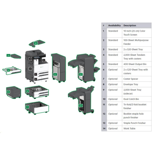 Funkcie: Lexmark e-Task 10" (25 cm) farebný dotykový displej, Farebný laser, Farebné skenovanie, Farebné sieťové skenovanie, Farebný tlač, Farebné faxovanie, Farebné kopírovanie, Trusted Platform Module (TPM)*, *Modul Trusted Platform Module (TPM) nie je v niektorých krajinách dostupný. - Tlačové náplne dodávané so zariadením: Čierna tonerová kazeta na 18 500* strán, 11 500* - farebné (CMY) tonerové kazety - Duplexný (obojstranný) tlač: Integrovaná duplexná - Pevný disk: Vrátane inteligentného úložného disku; Magnetický pevný disk je k dispozícii - Priame USB: Áno - Rýchlosť tlače (A4, čiernobiele): Až 65 strán / min. 1) - Čas prvej strany (čiernobiele): 4,7 sekundy 1) - Rýchlosť tlače (A4, farebne): Až 65 strán / min. 1) - Pamäť, štandardná: 4096 MB - Maximálny mesačný funkčný cyklus: 340 000 strán za mesiac 2) - Odporúčaný mesačný objem tlače: 7 000 - 50 000 strán 2) - Dotykový displej: Áno - Kapacita vstupu papiera, štandardne: Až 3140 strán - Záručná doba produktu: 1-ročná služba na mieste, Next Business Day