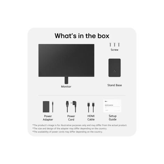 - Základňa stojanu 2. Skrutky 3. Napájací adaptér 4. Napájací kábel 5. Kábel HDMI 6. Návod na nastavenie
