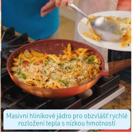 Vďaka neprilnavému povlaku odolnému proti poškriabaniu je zaručený skvelý zážitok z varenia, bez pripálenia čohokoľvek. Šťavnaté steaky, jemné ryby a chrumkavá zelenina môžete pripravovať takmer bez tuku a oleja. Pevné hliníkové jadro vašej Livington Copper & Stone Pan zabezpečuje extrémne rýchle a rovnomerné zohrievanie panvice s nízkou hmotnosťou.