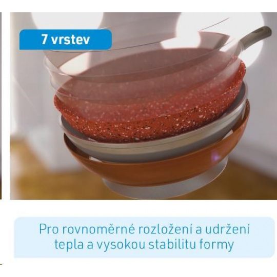 Tajomstvo panvice spočíva v jej vrstvách. Hliníkové teliesko je kombinované s extra silnou oceľovou vložkou. Jej základ tvorí odolná kamenná vrstva pre nesrovnateľne dlhú životnosť a akumuláciu tepla. Meď zušľachťuje kamennú vrstvu pre dokonalé rozloženie tepla. Senzčné zloženie panvice zakončujú 3 vrstvy vysoko kvalitného neprilnavého povlaku.