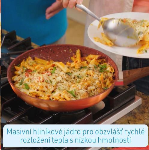 Vďaka neprilnavému povlaku odolnému proti poškriabaniu je zaručený skvelý zážitok z varenia, bez pripálenia čohokoľvek. Šťavnaté steaky, jemné ryby a chrumkavá zelenina môžete pripravovať takmer bez tuku a oleja. Pevné hliníkové jadro vašej Livington Copper & Stone Pan zabezpečuje extrémne rýchle a rovnomerné zohrievanie panvice s nízkou hmotnosťou.