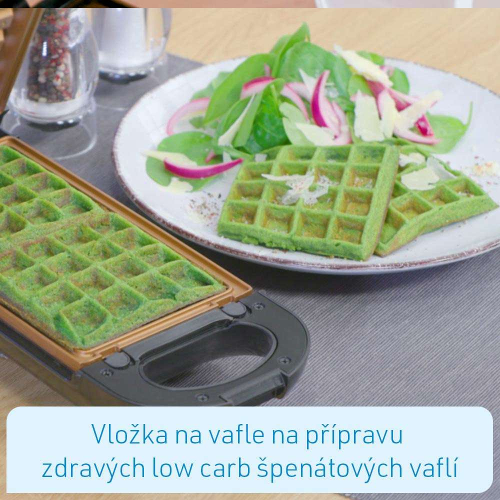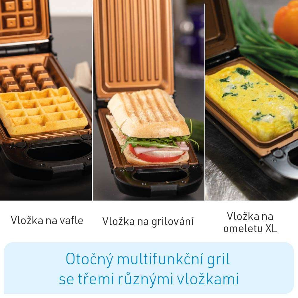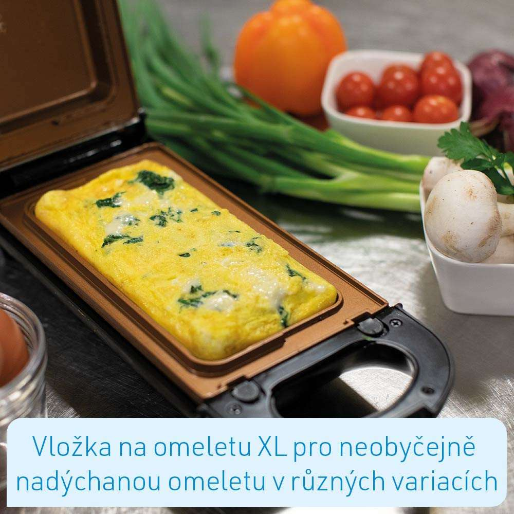 - Vrátane 3 vymeniteľných vložiek na prípravu XL omelet, grilovaných špecialít a vaflí