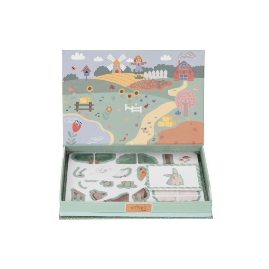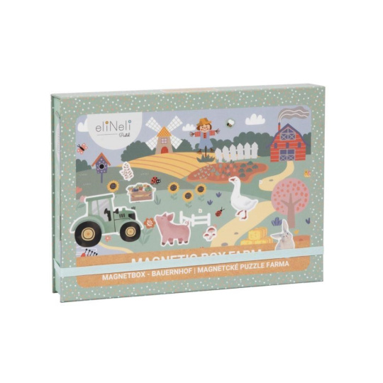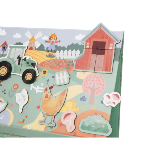 Magnetická hra 2v1 zavedie deti na farmu so zvieratkami, ktoré môžu stretnúť vo svojom okolí, v ich reálnej (skutočnej) podobe. Na magnetickom obrázku s vidieckou krajinou si deti vytvoria vlastnú farmu alebo sa len pohrajú s jednoduchým puzzle. Z jednotlivých dielikov puzzle deti poskladajú traktor, zvieratká alebo podľa priložených kartičiek celé obrázky.
