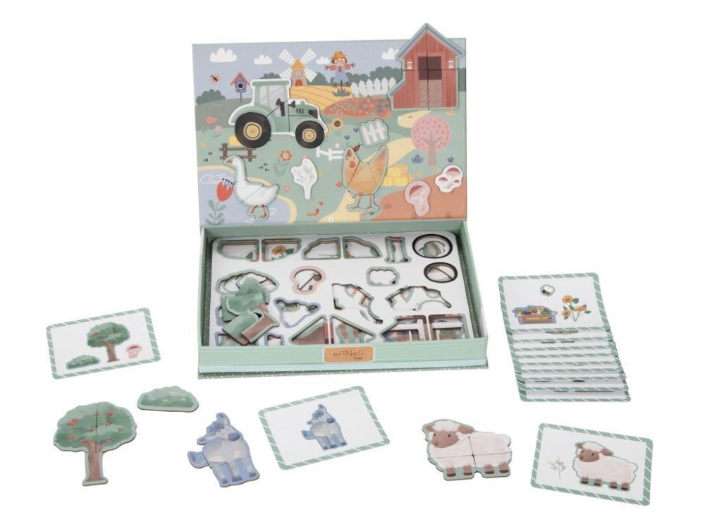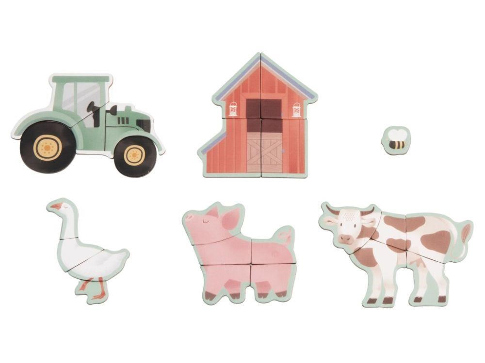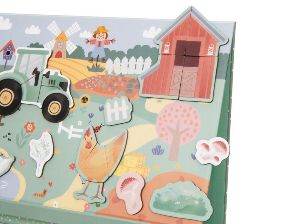 Magnetická hra 2v1 zavedie deti na farmu so zvieratkami, ktoré môžu stretnúť vo svojom okolí, v ich reálnej (skutočnej) podobe. Na magnetickom obrázku s vidieckou krajinou si deti vytvoria vlastnú farmu alebo sa len pohrajú s jednoduchým puzzle. Z jednotlivých dielikov puzzle deti poskladajú traktor, zvieratká alebo podľa priložených kartičiek celé obrázky.