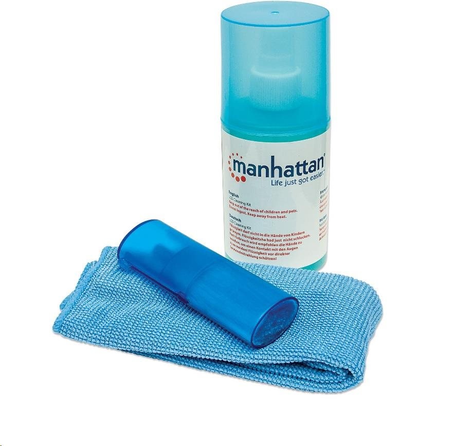 Pre dosiahnutie najlepších výsledkov nastriekajte čistiaci prostriedok na handričku z mikrovlákna, jemne utrite a potom rýchlo vysušte prebytočnú tekutinu z povrchu LCD. Bezpečný na časté používanie na povrchoch LCD, aby pomohol obnoviť a udržať jas a čistotu. Spoločnosť Manhattan neodporúča aplikovať čistiaci roztok priamo na akýkoľvek povrch LCD. Neodporúča sa používať na antireflexné, súkromné alebo polarizačné materiály.