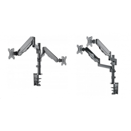 Univerzálny plynový pružinový držiak Manhattan pre dva monitory bezpečne udrží dva 17" až 32" televízory alebo monitory. Keďže na uchytenie displejov sa používajú plynové pružiny, ramená stačí len ľahký dotyk, aby ste ich posunuli do najlepších pozorovacích uhlov pre vaše účely. Vysokokvalitná hliníková a oceľová konštrukcia držiaka vám poskytne roky spoľahlivej prevádzky. Univerzálny držiak Manhattan s plynovou pružinou a dvoma monitormi je ideálny na inštaláciu na veľký stôl a umožňuje vám využiť väčší rozsah pohybu, aby ste mali viac priestoru na prácu.