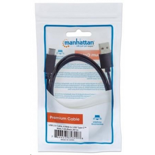 MANHATTAN USB kábel 2.0 C, C samec / A samec, 1 m, čierna