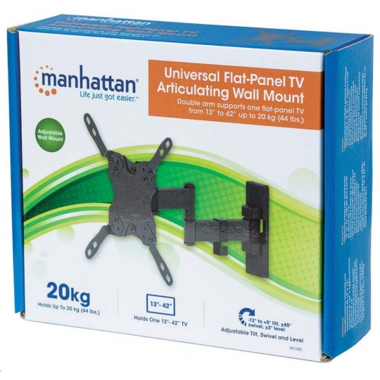 Overcome an odd floor plan, annoying glare or awkward furniture placement that can limit the enjoyment of your flat-panel TV. The Manhattan Universal Flat-Panel TV Articulating Wall Mount folds nearly flat against the wall and safely extends on a strong, double-jointed arm to help you achieve prime viewing positions from almost anywhere in the room. VESA-compliant and constructed of quality materials, this articulating wall mount fits a range of display sizes for a secure and confident above-the-floor TV installation. It's the perfect fit for mounting a TV in your living room, bedroom or den, as well as for commercial uses in hotels, classrooms, conference rooms, for digital signage and more. Wherever you install it, the Manhattan Universal Flat-Panel TV Articulating Wall Mount puts the best TV viewing experience front and center.
