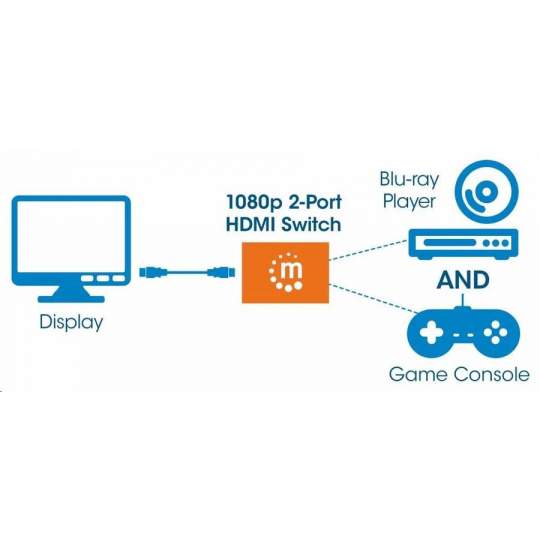 Jednoducho pripojte viacero zdrojov HDMI k jednému displeju.Manhattan 1080p 2-portový prepínač HDMI pripája dva zdroje videa HDMI - vrátane herných konzol, prehrávačov Blu-ray, satelitných prijímačov, digitálnych rekordérov, set-top boxov a ďalších zariadení - na jeden displej s vysokým rozlíšením.Flexibilné riešenie pre mnohé HD aplikácieS rastúcim počtom dostupných multimediálnych zariadení s vysokým rozlíšením rozširuje 2-portový HDMI prepínač Manhattan 1080p možnosti pripojenia pre váš HDTV, plochý monitor alebo videoprojektor. Prepínač automaticky rozpozná a vyberie aktívny zdroj HDMI a nasmeruje signál na displej. Tlačidlo manuálnej voľby navyše umožňuje používateľom vybrať zdroje, keď je súčasne zapnutých viac ako jeden zdroj HD videa.Najlepšia možná kvalita obrazuPlná zhoda s HDMI a HDCP 1.0 a 1.1 zaručuje, že 2-portový HDMI prepínač Manhattan 1080p poskytuje vysokokvalitný výkon a spoľahlivosť. Poskytuje obraz v plnom rozlíšení 1080p a podporuje 3D video, ako aj zvuk LPCM, DTS a Dolby TrueHD.