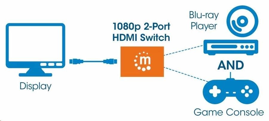 Jednoducho pripojte viacero zdrojov HDMI k jednému displeju.Manhattan 1080p 2-portový prepínač HDMI pripája dva zdroje videa HDMI - vrátane herných konzol, prehrávačov Blu-ray, satelitných prijímačov, digitálnych rekordérov, set-top boxov a ďalších zariadení - na jeden displej s vysokým rozlíšením.Flexibilné riešenie pre mnohé HD aplikácieS rastúcim počtom dostupných multimediálnych zariadení s vysokým rozlíšením rozširuje 2-portový HDMI prepínač Manhattan 1080p možnosti pripojenia pre váš HDTV, plochý monitor alebo videoprojektor. Prepínač automaticky rozpozná a vyberie aktívny zdroj HDMI a nasmeruje signál na displej. Tlačidlo manuálnej voľby navyše umožňuje používateľom vybrať zdroje, keď je súčasne zapnutých viac ako jeden zdroj HD videa.Najlepšia možná kvalita obrazuPlná zhoda s HDMI a HDCP 1.0 a 1.1 zaručuje, že 2-portový HDMI prepínač Manhattan 1080p poskytuje vysokokvalitný výkon a spoľahlivosť. Poskytuje obraz v plnom rozlíšení 1080p a podporuje 3D video, ako aj zvuk LPCM, DTS a Dolby TrueHD.