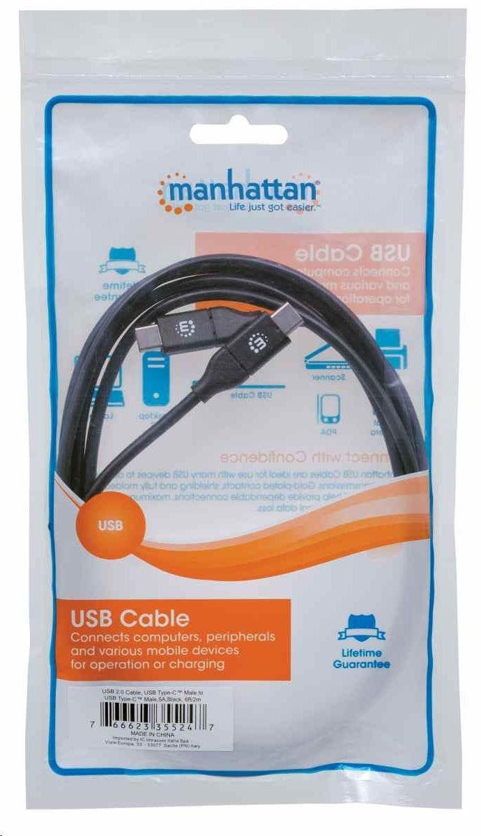 Kábel Manhattan USB-C, USB 2.0, samec na samca, 480 Mb/s, 5 A, 2 m, čierna