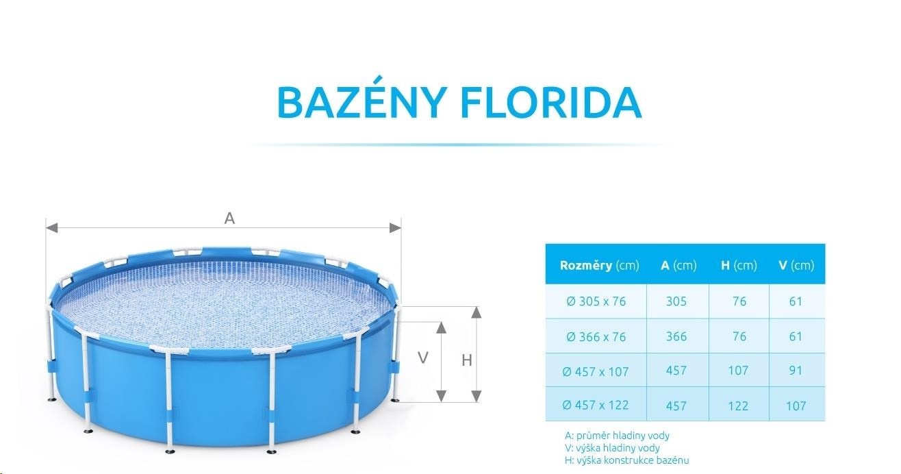 Bazén Marimex Florida sa radí medzi veľmi obľúbené nadzemné bazény v Českej republike. Kúpanie vo vlastnom veľkom bazéne si môže dopriať naozaj každý. Hlavným benefitom bazéna Florida je výhodná cena, jednoduchá údržba, stabilita konštrukcie, široká hladina vody aj ľahké spustenie do prevádzky. Stačí len pripraviť miesto na bazén, rozbaliť bazénovú podložku, bazén rozbaliť, zostaviť opornú konštrukciu, na ktorú sa navlečie bazénová fólia. Od vybalenia bazéna môžete do 30 minút napúšťať vodu.