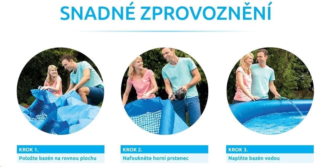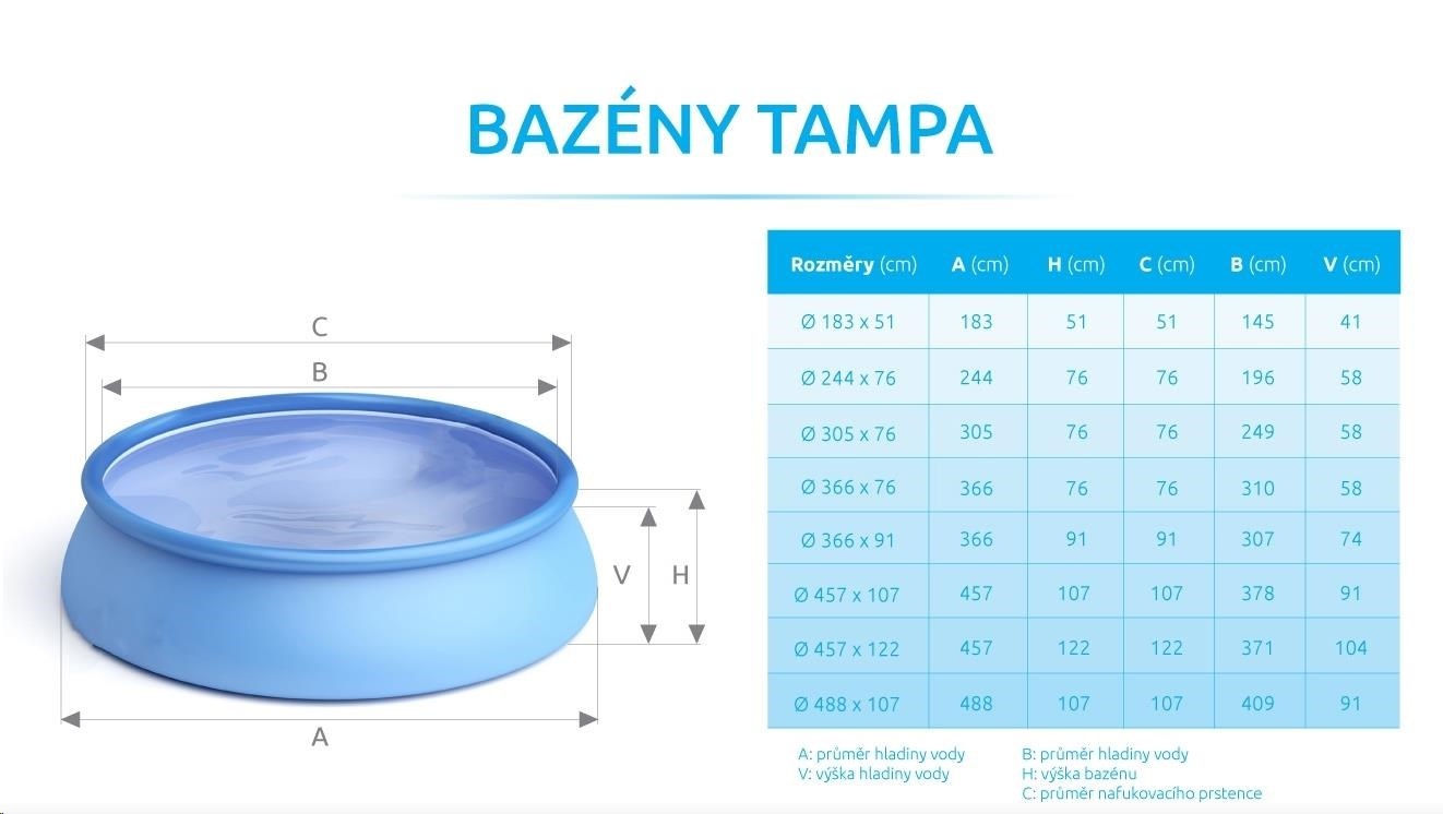 Bazén Tampa se řadí mezi nejprodávanější a nejoblíbenější bazény v České republice. Koupání ve vlastním bazénu si může dopřát opravdu každý. Předností bazénu Tampa je nízká cena, snadná údržba i rychlé zprovoznění. Stačí jen připravit místo na bazén, rozvinout bazénovou podložku, bazén rozbalit, nafouknout horní límec a začít napouštět vodu. Stoupající voda sama bazén postaví. Od vybalení bazénu můžete do 10 minut napouštět vodu. Bazén je nutné po skončení bazénové sezony vyčistit, vypustit a uklidit na suché, nemrznoucí místo. Správnou údržbou prodloužíte životnost bazénu. Doporučujeme bazén po koupání zakrývat krycí plachtou. Pro snadné nafouknutí doporučujeme zakoupit ruční či elektrickou pumpu.
