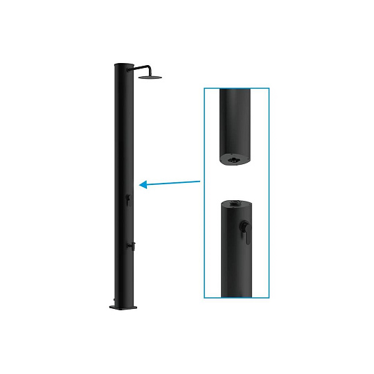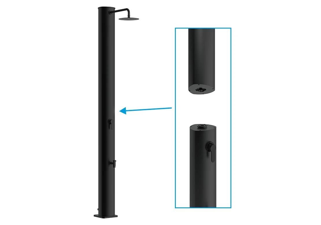Zahradní dvoudílná a skladná sprcha DUO s objemem 40 l pro venkovní použití zajistí ohřev vody přiváděné ze zahradní hadice a tím perfektní pocit pohodlí při sprchování teplou nebo vlažnou vodou. Sprcha má pákovou baterii i kohoutek na oplach nohou. Ohřev vody zajišťuje sluneční záření a tělo sprchy, které funguje jako solární kolektor. Pro sprchování musí být zahradní sprcha stále napojena na vodovodní řad. Není-li napojena, nelze se sprchovat. Sprcha se kotví pomocí 4 šroubů (nejsou součástí balení) pevně k zemi, čímž je zajištěna její perfektní stabilita.