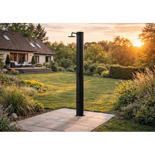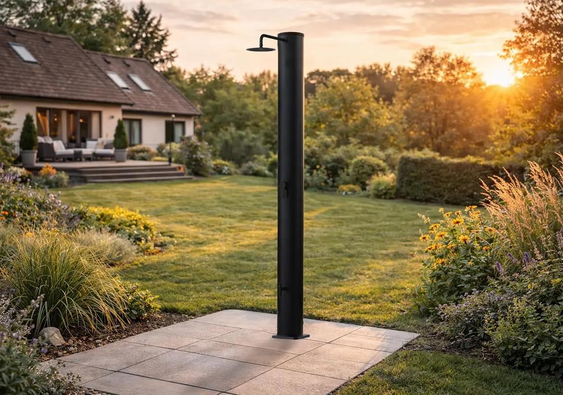 Solární sprchy se dají využívat samostatně, ale můžou tvořit i doplněk k bazénům. Pomáhají tak před zbytečným znečištěním bazénové vody například od trávy či hlíny.