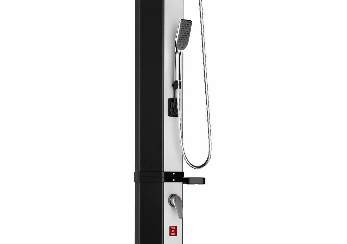 Sprcha je též vybavena ventilem pro možnost nastavení teploty výstupní vody. S ohledem na teplotu vody uvnitř sprchy, která může dosahovat až 60 °C, se doporučuje nejprve natočit ventil vpravo, jeho vychýlením směrem od těla sprchy pustit studenou vodou a následovně vodu domíchat na požadovanou teplotu natáčením ventilu směrem vlevo. Sprcha je vyrobena z plastu.
