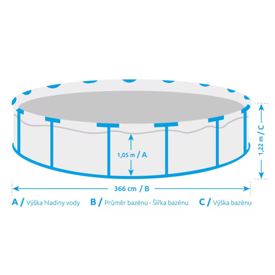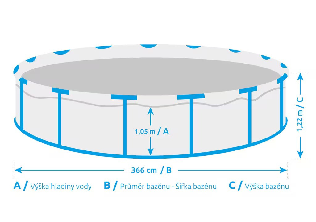 Uvedené rozměry bazénu jsou pouze orientační a ovlivnit je může rovnost podkladu či objem napuštěné vody. Povolená výrobní odchylka je 5 %.
