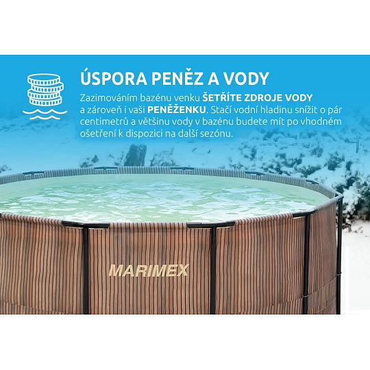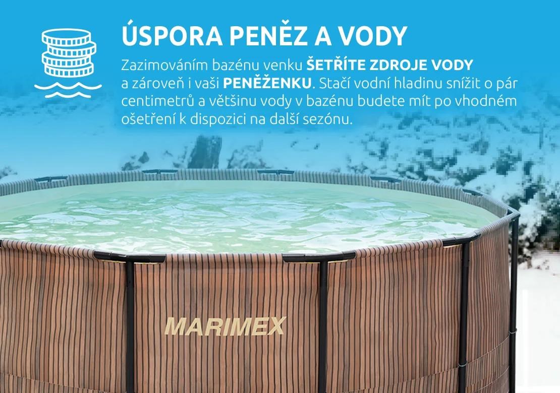 Další předností je, že u bazénu Marimex Florida si můžete vybrat, zda bazén na zimu vypustíte, složíte a uvolníte zahradu pro jiné aktivity, nebo ho zazimujete a ponecháte venku. Tím, že ho necháte na zahradě i mimo koupací sezónu, ušetříte čas, peníze za vodu, a hlavně i samotnou vodu. Při zazimování venku v bazénu zůstane více než 80 % vody, kterou v další sezóně opakovaně využijete. Jedná se o ekologické řešení zazimování bazénu.