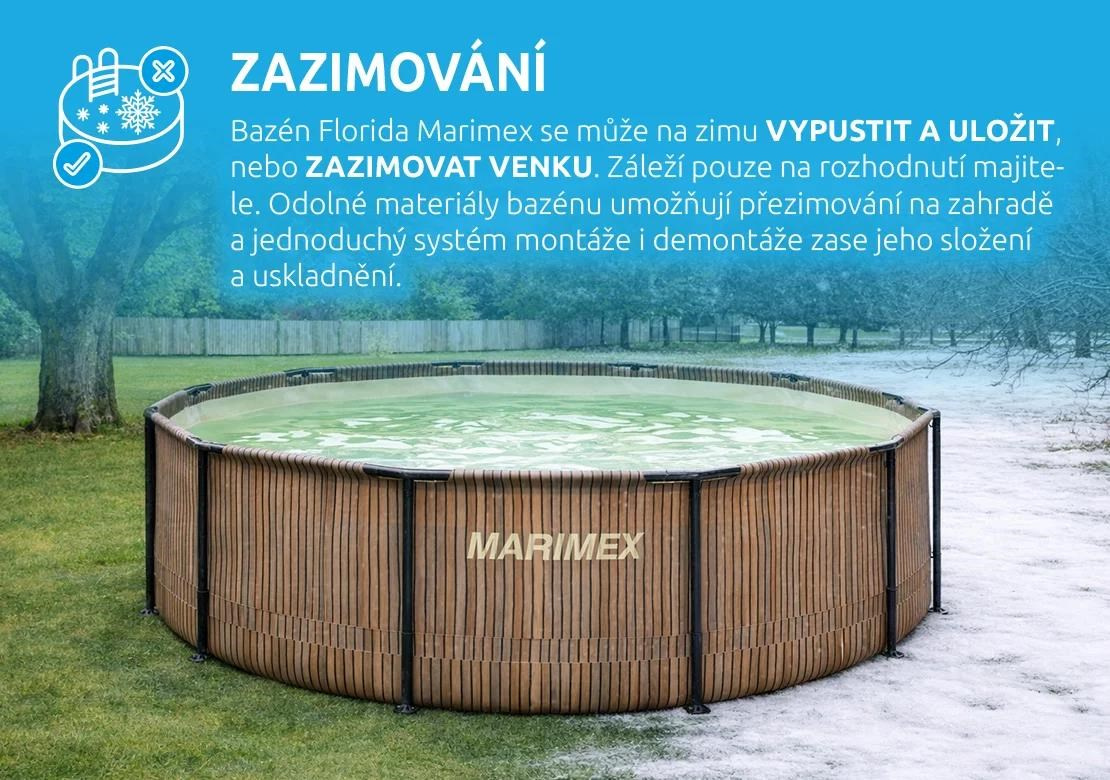 Bazén Florida Marimex můžete zazimovat a ponechat venku, nebo ho vypustit a složit. Pokud se rozhodnete uložit ho, bazén je potřeba vypustit, umýt od nečistot, osušit a uložit na suché místo, kde nemrzne. Je vhodné ho v průběhu zimy občas přeskládat, aby ve folii nevznikaly přehyby. Pokud se bazén rozhodnete ponechat na zahradě, je potřeba upustit vodu, odpojit filtraci a další příslušenství a do bazénu aplikovat chemické přípravky pro zazimování bazénu.