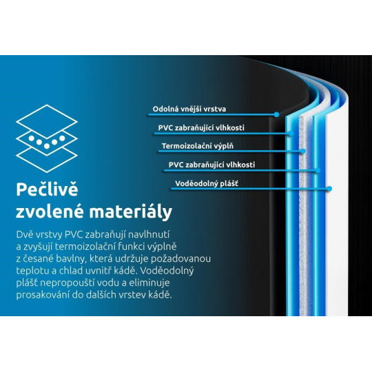 Dve vrstvy PVC a výplň z česanej bavlny zabezpečujú perfektnú tepelnoizolačnú funkciu a zabraňujú navlhnutiu. Vodotesný plášť navyše eliminuje presakovanie a udržiava obsah kády v perfektnom stave.