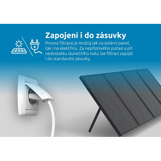 Prevádzka filtračného systému je možná ako na solárny panel, tak aj na elektrinu. Za nepriaznivého počasia a pri nedostatku slnečného žiarenia možno filtračný systém zapojiť aj do štandardnej zásuvky.