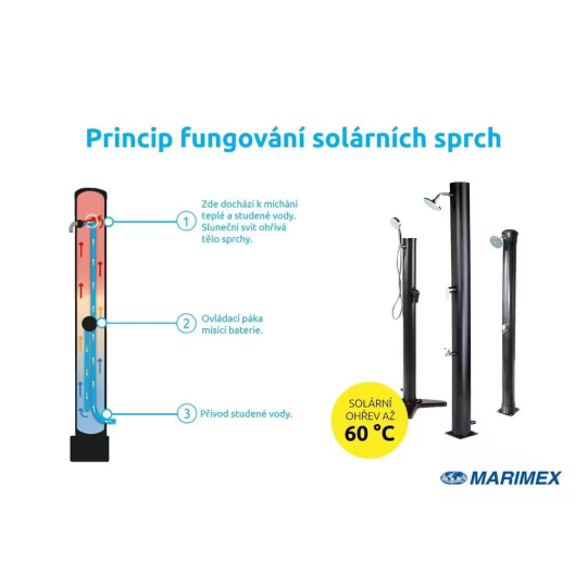 Zabezpečí ohrev vody dodávanej zo záhradnej hadice a tým dokonalý pocit pohodlia pri sprchovaní teplou alebo vlažnou vodou. Ohrev vody zabezpečuje slnečné žiarenie a telo sprchy, ktoré funguje ako solárny kolektor.