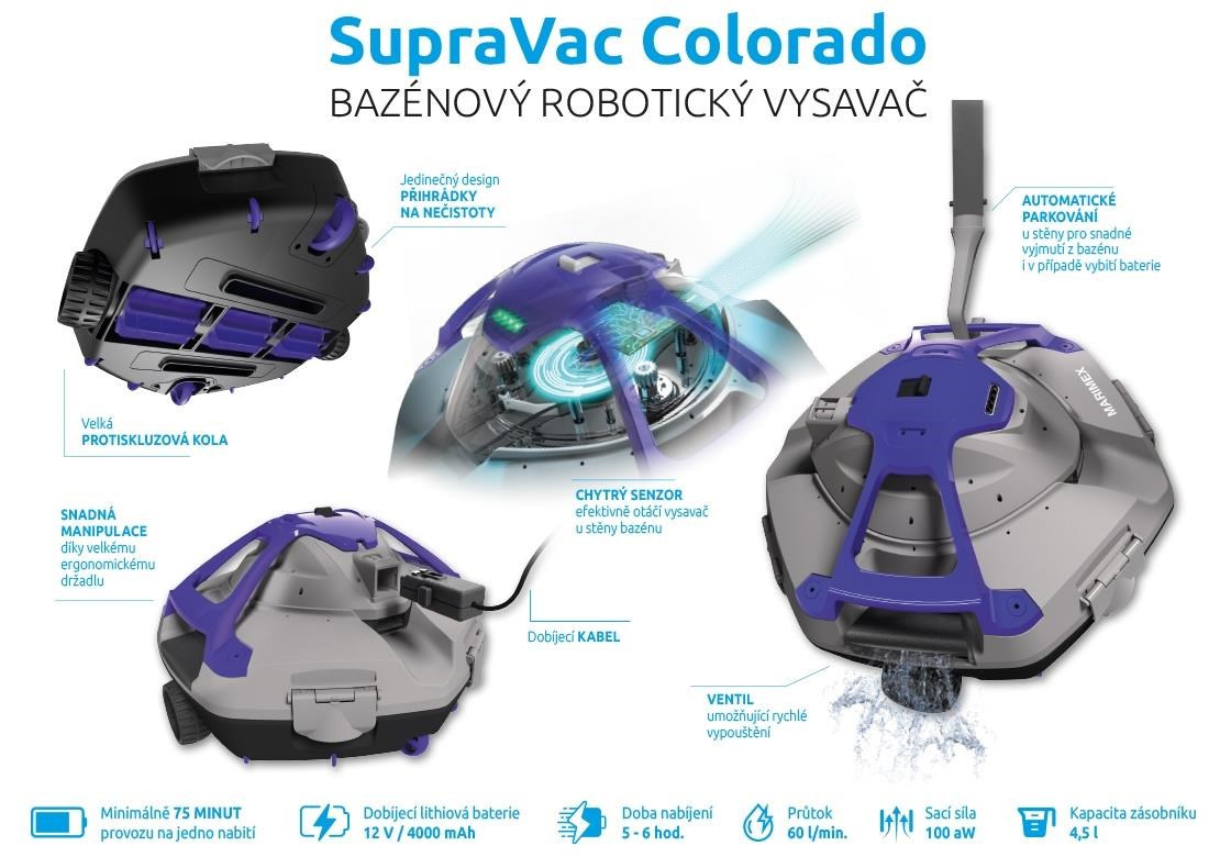 Bezdrôtový a prenosný robotický vysávač Marimex SupraVac Colorado je vhodný pre nadzemné aj zapustené bazény do priemeru 9 m a celkovej veľkosti dna do 65 m2. Vysávač disponuje chytrým senzorom, vďaka ktorému sa efektívne otáča pri stene bazéna. Vďaka vodnému senzoru sa automaticky zapne alebo vypne. Funkcia automatického parkovania zabezpečí, že vysávač sa zastaví vždy pri stene bazéna, čo umožňuje následné ľahké vybratie vysávača z bazéna.