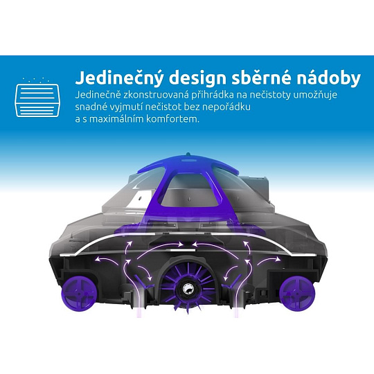 Veľké protisklzové kolesá zabezpečujú stabilný a spoľahlivý pohyb vysávača aj na klznkom povrchu bazéna. Integrovaný chytrý senzor efektívne otáča vysávač pri stene bazéna a tým zabezpečuje dôkladné čistenie celého dna. Jedinečne konštruovaná priehradka na nečistoty umožňuje jednoduché vybratie nečistôt bez neporiadku a s maximálnym komfortom.
