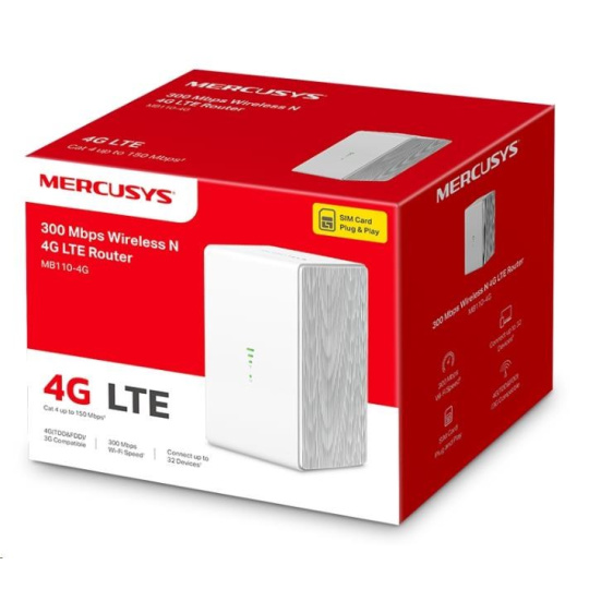 | Package Contents | 300 Mbps Wireless N 4G LTE Router (MB110-4G) Napájací adaptér RJ45 Ethernetový kábel Rýchly inštalačný sprievodca |