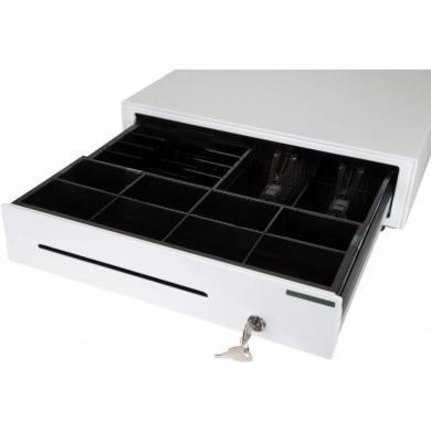 cash drawer, front opening, dimensions (WxHxD): 410x114x415mm, insert: 6 note compartments, 8 coin compartments, 1 receipt compartment, direct printer connection, RJ12, colour: white