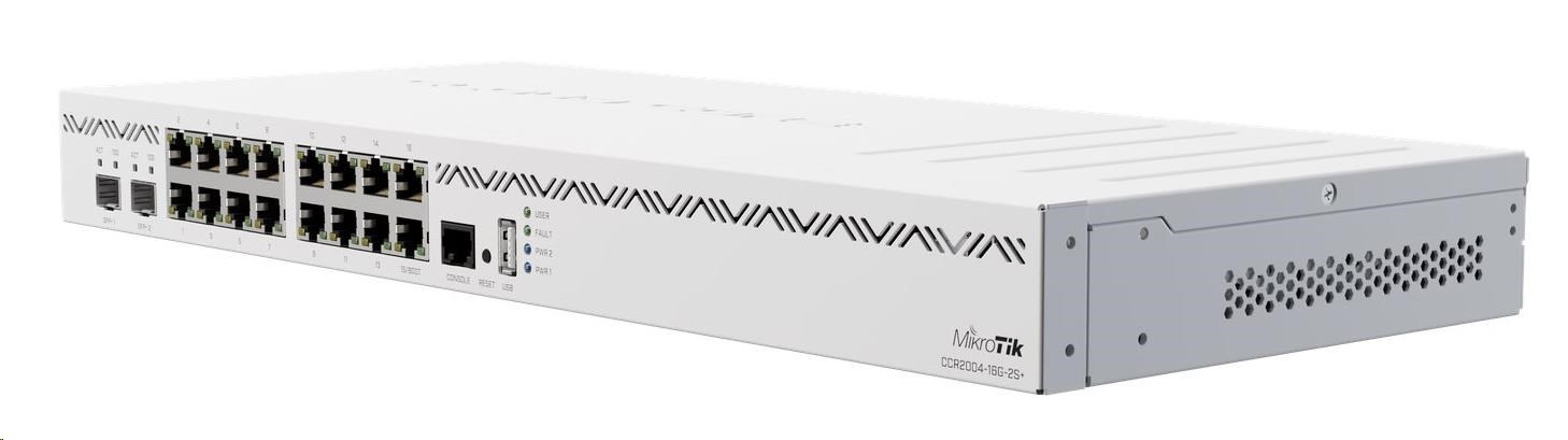 CCR2004-16G-2S+ je 19" rackový smerovač z novej série smerovačov CCR, ktorý sa vyznačuje najvyšším pomerom výkonu na jadro spomedzi všetkých smerovačov CCR, čo je najdôležitejší aspekt, pokiaľ ide o náročnejšie operácie založené na spracovaní na jedno pripojenie (napr. QoS). Smerovač poháňa 64-bitový procesor architektúry ARM s taktom 1700 MHz, má 4 GB pamäte DDR4 RAM a 128 MB úložiska NAND.