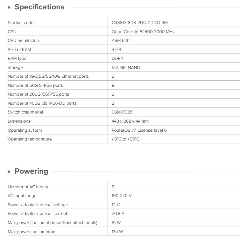 400 Gigabitové připojení bez cenového šoku! CRS812 DDQ je další krok vpřed – výkonný, efektivní a cenově dostupný způsob, jak dostat 50G, 200G a 400G do vašeho racku. RouterOS v7 Hot-swap ventilátory Dvojité redundantní hot-swap napájecí zdroje Čtyřjádrový ARM CPU 2 GHz 4 GB RAM Kde najde uplatnění? Top-of-rack / leaf switch s 400G uplinky do spine vrstvy Campus core propojující starší 10G s moderními 50G rozhraními Agregační uzel pro poskytovatele služeb Laboratoře, AI clustery, mediální workflow s vysokými nároky na „east-west“ provoz 400G dříve znamenalo drahé, složité a nedostupné řešení. CRS812 DDQ to mění! Moderní Marvell switch čip a výkonný ARM CPU přináší pokročilé routovací, switchovací a traffic management funkce důvěrně známé z milionů nasazení RouterOS – nyní až do 400 Gbps! CRS812 posune vaši síť z 10 až na 400G v jednom jednoduchém a cenově dostupném RouterOS v7 boxu – bez nutnosti velkých investic. 400 Gigabitů je nyní dostupných – budoucnost sítě bez kompromisů a se zachováním kompatibility s existující infrastrukturou! Podporované rychlosti rozhraní CRS812 2× 1G/2.5G/5G/10G Ethernet porty 8× 1G/2.5G/5G/10G/25G/50G SFP56 porty 2× 40G/50G/100G/200G QSFP56 porty 2× 40G/50G/100G/200G/400G QSFP-DD porty * QSFP56 / QSFP-DD porty podporují také break-out režimy až na 1G/2.5G/5G/10G/25G/50G Technické specifikace Kód produktu: CRS812-8DS-2DQ-2DDQ-RM CPU: Quad-Core AL52400 2000 MHz Architektura CPU: ARM 64bit RAM: 4 GB DDR4 Úložiště: 512 MB NAND Ethernet porty: 2× 1G/2.5G/5G/10G SFP56 porty: 8× 50G QSFP56 porty: 2× 200G QSFP-DD porty: 2× 400G Switch čip: 98DX7335 Rozměry: 443 × 268 × 44 mm OS: RouterOS v7, License L6 Provozní teplota: -10 °C až +50 °C Počet AC vstupů: 2 AC vstupní rozsah: 100–240 V Napětí adaptéru: 12 V Proud adaptéru: 20,8 A Max. spotřeba (bez příslušenství): 81 W Max. spotřeba: 134 W Dodávané příslušenství 2× napájecí kabel Rackmount uši Zadní rackmount uši Sada pro uchycení Související 400G příslušenství 400G DAC, 1 m – DDQ+DA0001 400G DAC, 3 m – DDQ+DA00031 400G optický transceiver, 100 m – DDQ+85MP01D Upozornění: Výrobce MIKROTIK nevztahuje záruku na zařízení poškozená přepětím. Zařízení je třeba na vstupech adekvátně chránit proti indukovanému elektrostatickému přepětí či přepěťovým špičkám na silovém vedení. Při venkovních instalacích je třeba používat stíněnou kabeláž (FTP/SFTP), příslušné přepěťové ochrany (pokud nejsou integrovány) a provést korektní a efektivní uzemnění. Zařízení vždy provozujte s poslední výrobcem publikovanou verzí (výrobcem označenou "Stable") operačního systému RouterOS. Taková verze garantuje nejoptimálnější funčknost, obsahuje opravené chyby z verzí předchozích a výkonová vylepšení. .