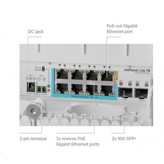 MikroTik netPower Lite 7R je reverzný PoE switch s 8x gigabitovými ethernetovými portami, dvoma SFP slotmi, DC napájacím konektorom, DC svorkovnicou a dvoma operačnými systémami SwOS. Prvých 7 portov LAN umožňuje napájanie cez PoE IN a 8.port podporuje výstup PoE na napájanie iného zariadenia, napr. napájaciu anténu, kameru alebo iný spínač. Výhodou reverzného PoE je nezávislosť od jedného konkrétneho zdroja napájania. Prostredníctvom PoE IN alebo DC konektora/zásuvky môžete súčasne napájať až 7 napájacích adaptérov, avšak napájanie bude vždy aktívne len z jedného. V prípade zlyhania sa automaticky presunie na ďalšie možné.