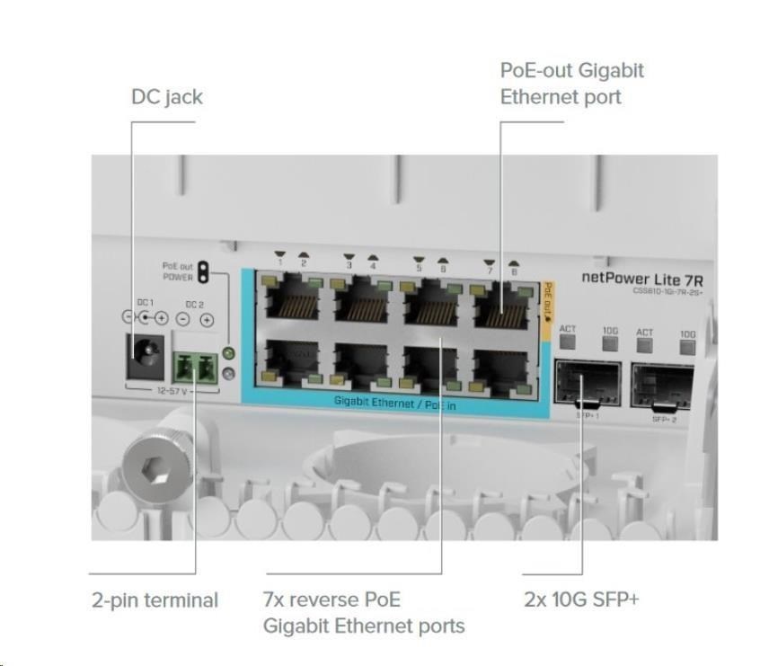 MikroTik netPower Lite 7R je reverzný PoE switch s 8x gigabitovými ethernetovými portami, dvoma SFP slotmi, DC napájacím konektorom, DC svorkovnicou a dvoma operačnými systémami SwOS. Prvých 7 portov LAN umožňuje napájanie cez PoE IN a 8.port podporuje výstup PoE na napájanie iného zariadenia, napr. napájaciu anténu, kameru alebo iný spínač. Výhodou reverzného PoE je nezávislosť od jedného konkrétneho zdroja napájania. Prostredníctvom PoE IN alebo DC konektora/zásuvky môžete súčasne napájať až 7 napájacích adaptérov, avšak napájanie bude vždy aktívne len z jedného. V prípade zlyhania sa automaticky presunie na ďalšie možné.