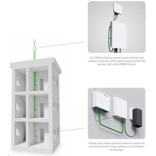 gPEN11 je nástenný injektor POE s dvoma gigabitovými ethernetovými portami, ktorý môžete použiť na napájanie zariadení určených na príjem alebo distribúciu pripojenia na mieste inštalácie. Výstupné napätie je rovnaké ako vstupné napätie a pohybuje sa v rozmedzí 12-57 V.